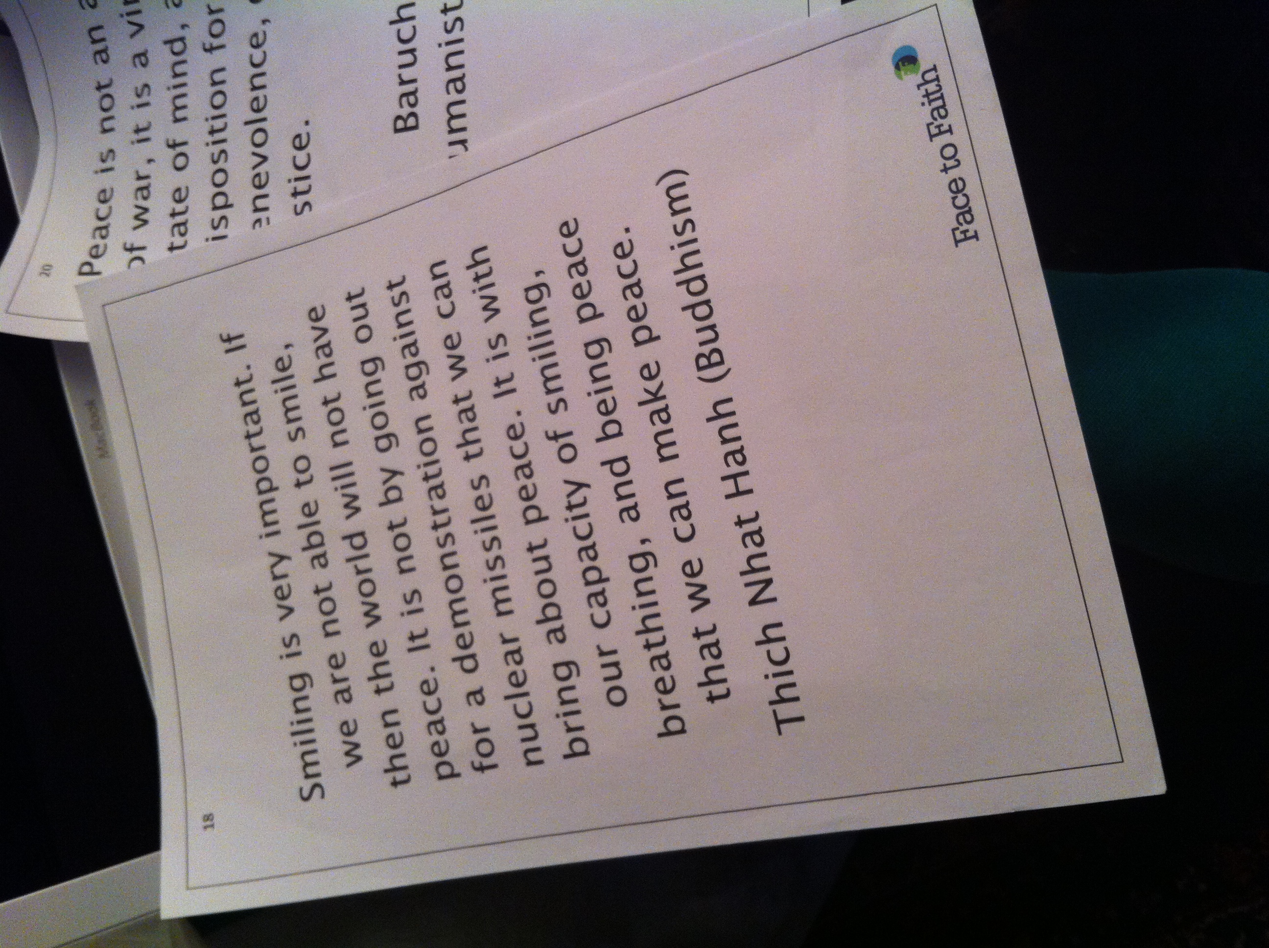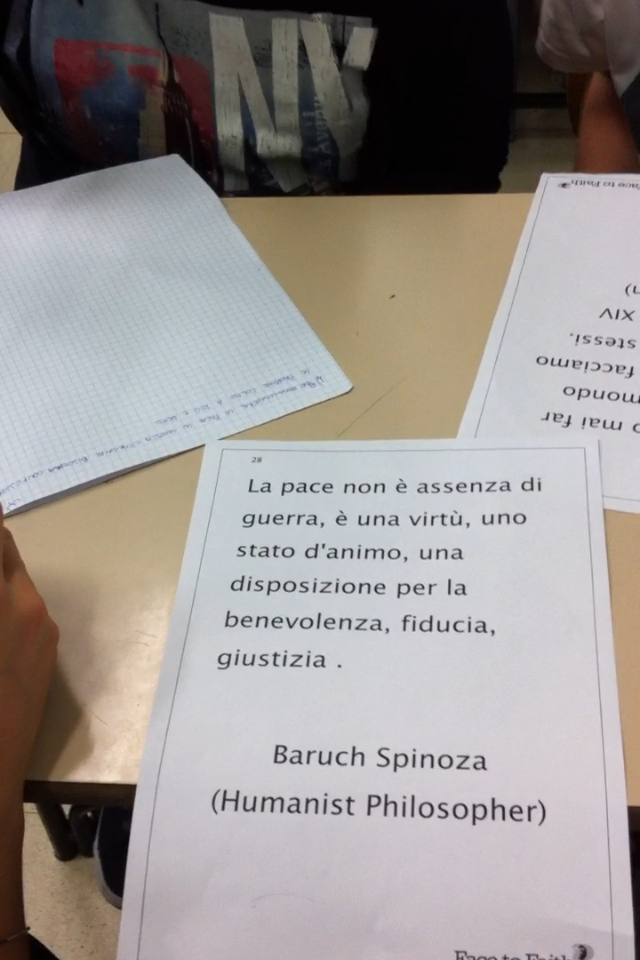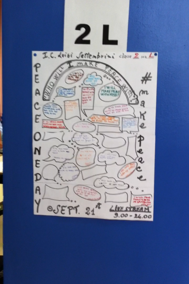 La classe 2L dell’IC Settembrini di Roma ha partecipato alla Videoconferenza Multipoint del 23 settembre, in occasione dell’evento mondiale PEACE ONE DAY: si è preparata al dialogo con due scuole ( una dell’ India e l’altra dall’Indonesia) con l’attività “Who will I make Peace with?” per cui è stato prodotto un coloratissimo cartellone. I ragazzi hanno anche condiviso e meditato su diverse citazioni riguardanti la pace. Particolarmete sentite quelle del filosofo Spinoza e del monaco buddsta vietnamita Thich Nhat Hanh.