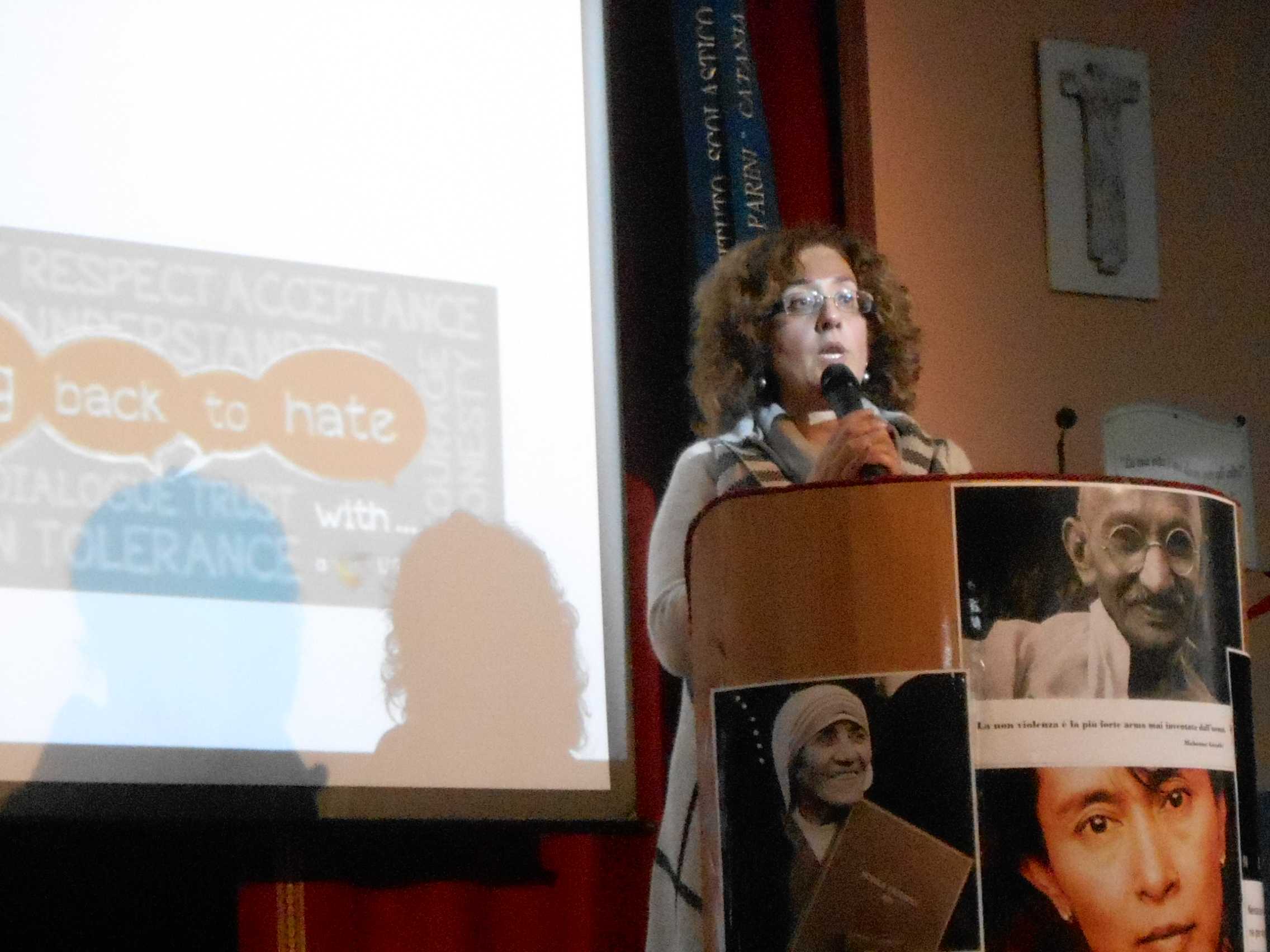 Gli interventi di Rita Toro (lead teacher F2F) e del Preside Giuseppe Adernò, sui valori fondanti del percorso formativo F2F, hanno preannunciato la pièce teatrale Talking back to hate scritta e rappresentata dagli alunni della II O e della II P.  “Se potessimo intessere nel mondo una trama di dialogo rispettoso, di solidarietà e fratellanza, il dolore e la sofferenza si dissolverebbero come tante bolle di sapone…”. “Oggi più che mai l’esempio e il messaggio di tutti i personaggi che hanno lottato per i diritti umani non possono cadere nell’oblio, bisogna continuare la loro lotta contro ‘tutte le lebbre’: egoismo, ignoranza, indifferenza, viltà…”. “Intessendo un filo di speranza noi giovani possiamo costruire un mondo pieno di valori in cui i diritti umani trionfino”. “ll linguaggio dell’amore risveglia le coscienze e crea l’armonia tra gli uomini, perché esso consolida la pace nel mondo.”
