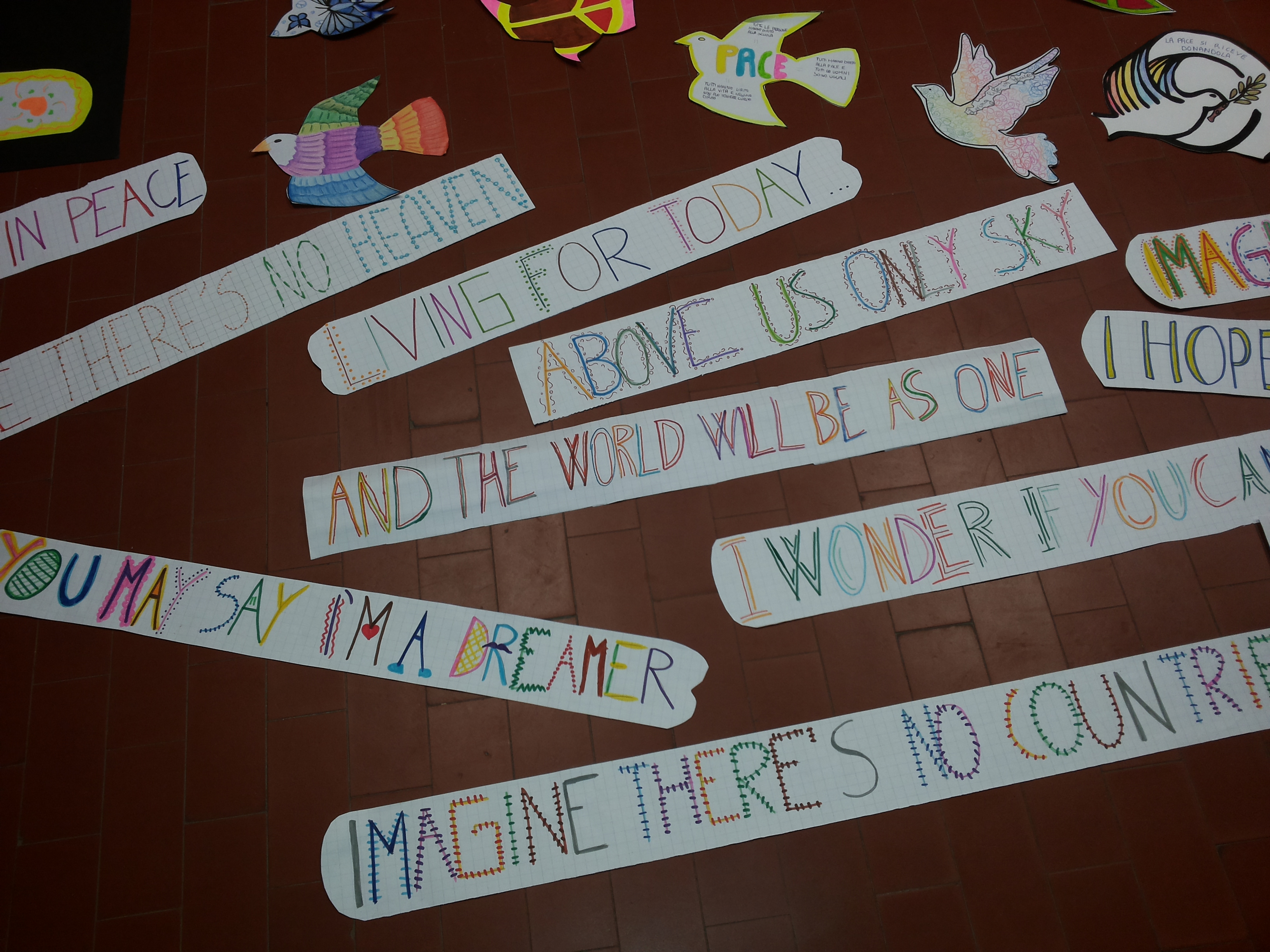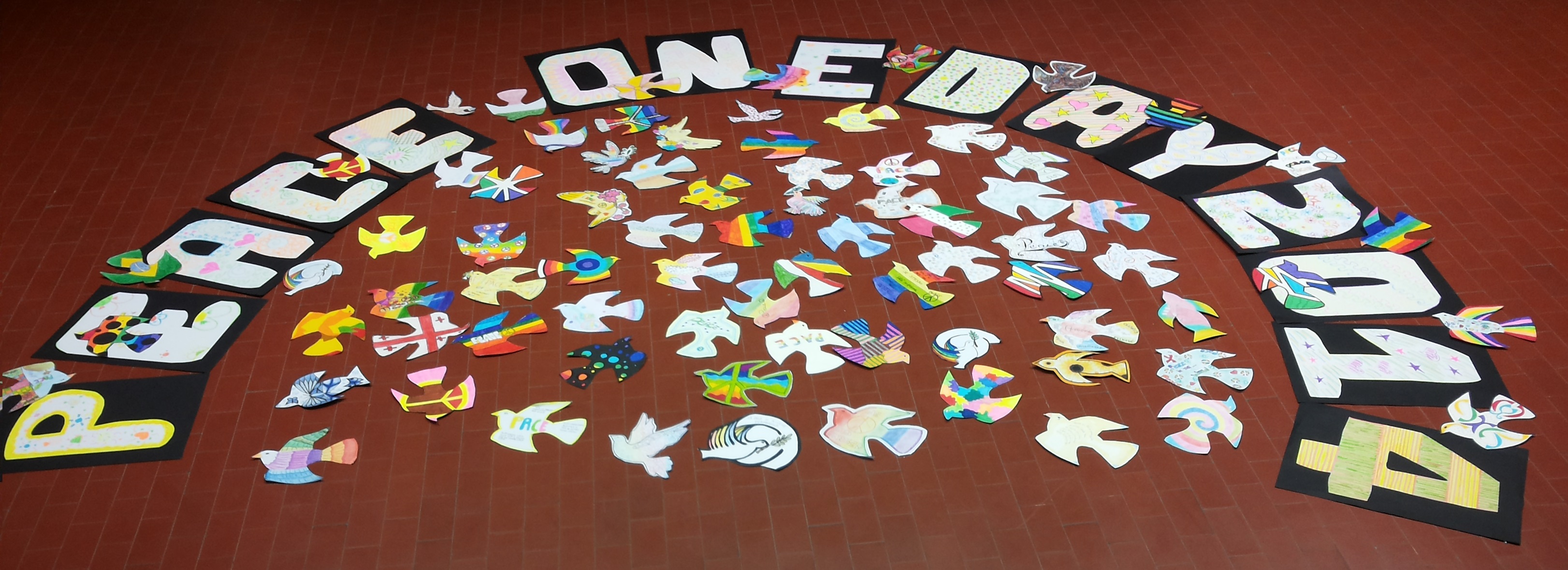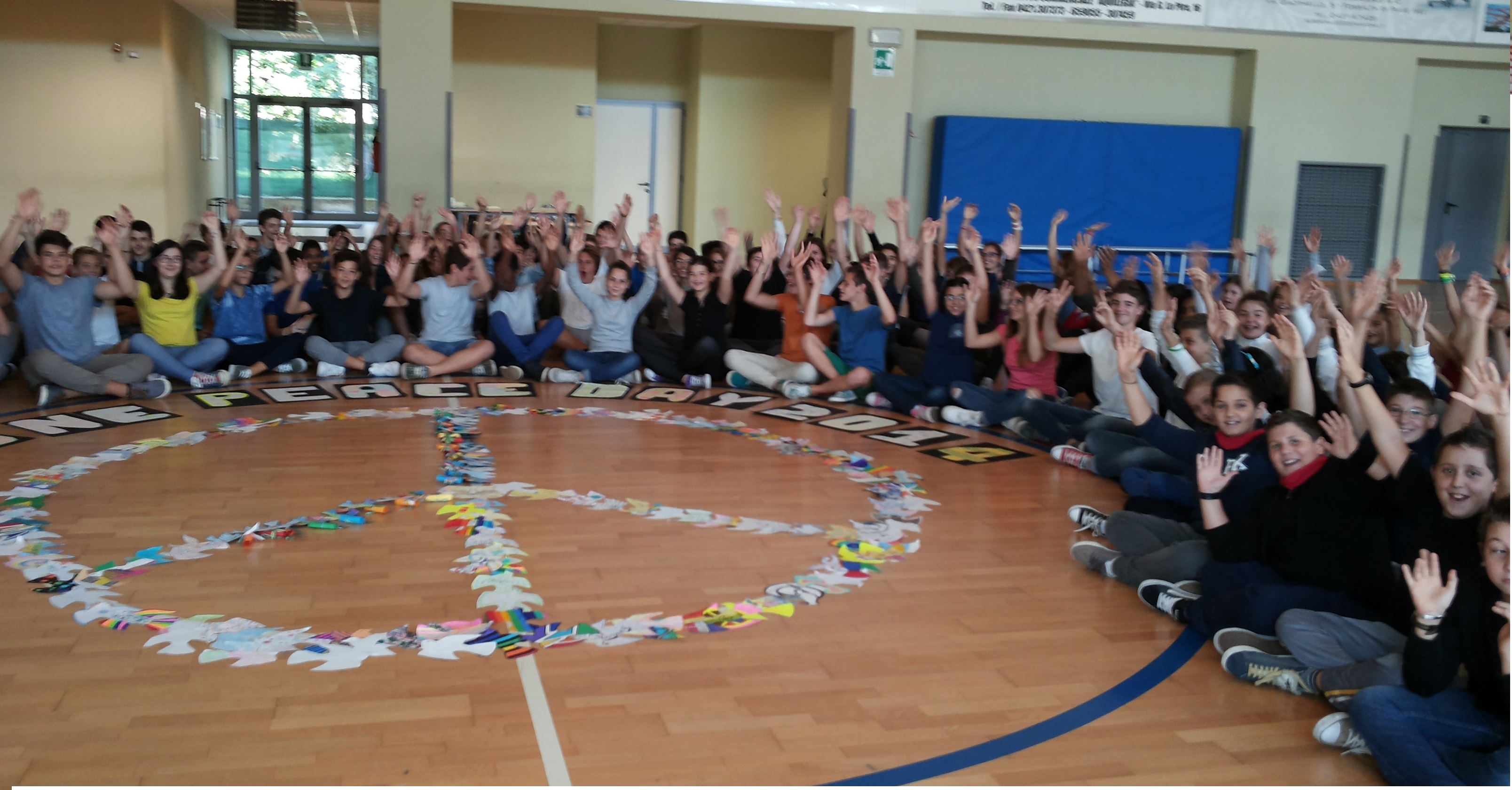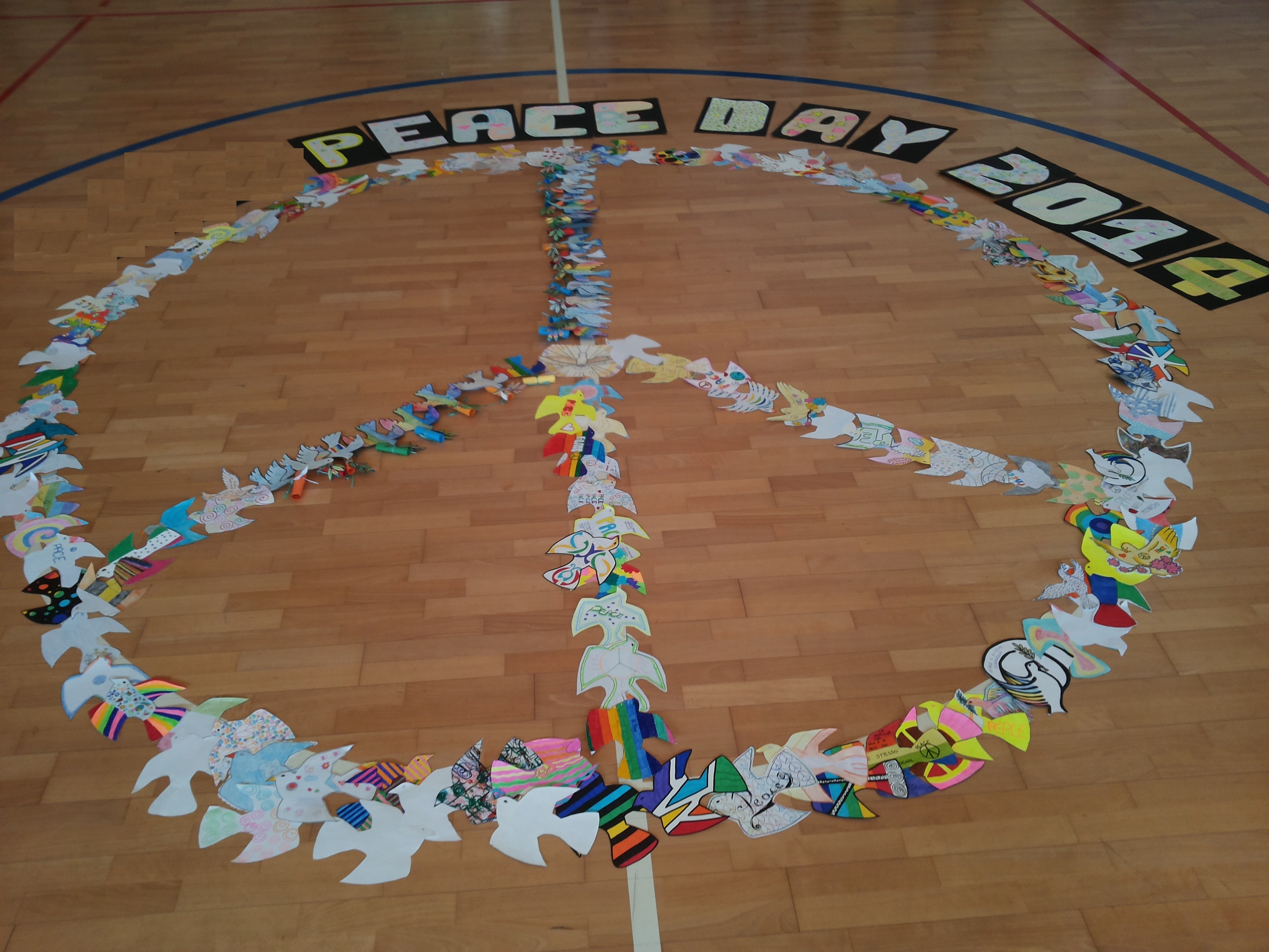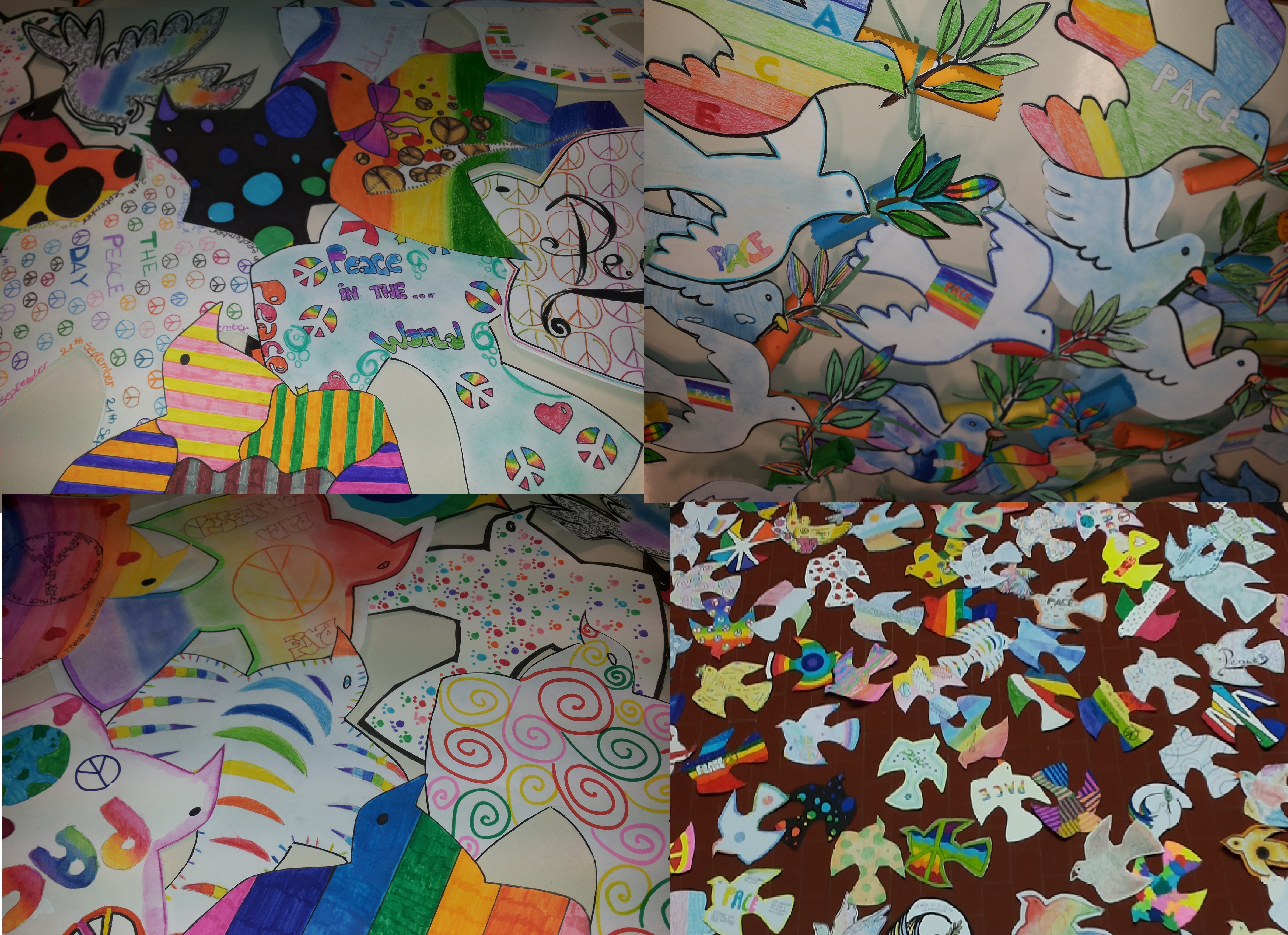 La mattina del 2 ottobre 2014 ci siamo dati appuntamento nella palestra per un abbraccio al simbolo della pace a conclusione dei vari percorsi che ogni classe ha compiuto per la celebrazione della Giornata Internazionale della Pace: letture, riflessioni, poesie, attività espressive … il tutto legato da un bel numero di colombe colorate che hanno ravvivato il clima e che ora colorano una delle pareti della scuola a ricordare ai nostri ragazzi che ognuno di loro anche con poco può diventare testimone di quella pace universale che dovrebbe essere diritto di tutti in ogni angolo del mondo.