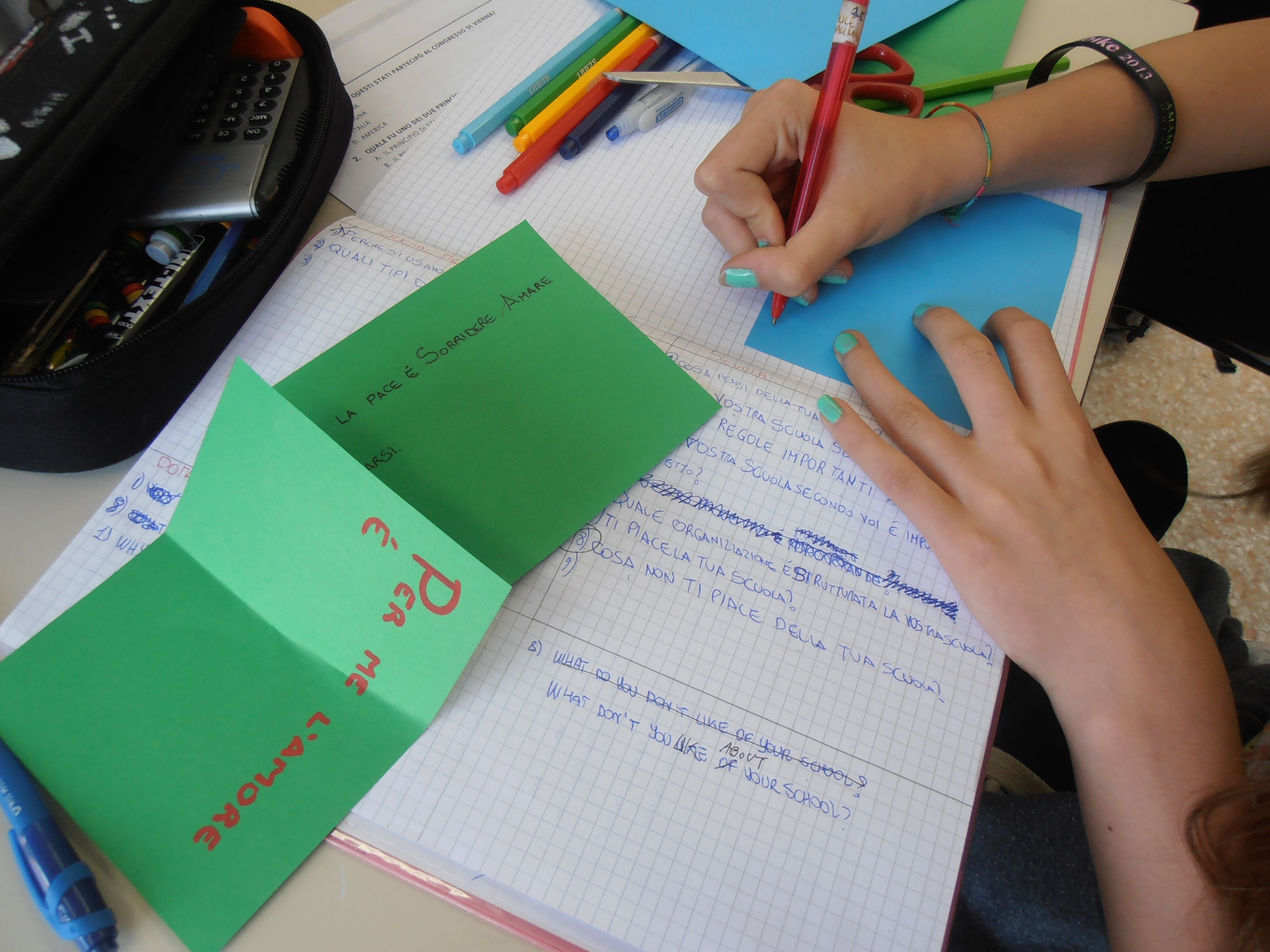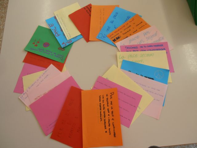 Da molti giorni gli alunni riflettono, molte mani ritagliano fogli colorati e scrivono messaggi di pace. Ecco ora è giunto il momento.