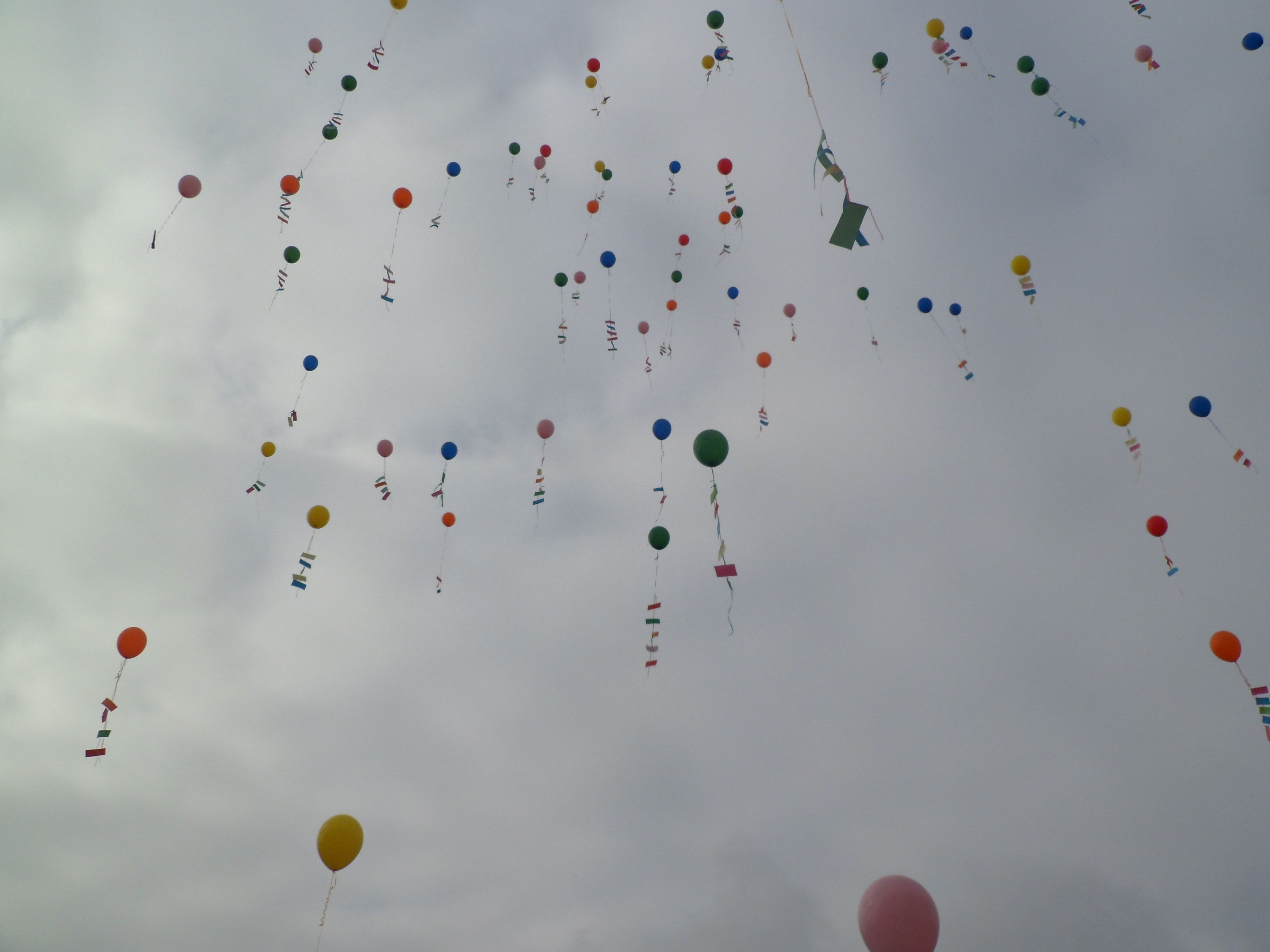 Alcuni ragazzi che rappresentano i compagni leggono i loro messaggi e…il momento è giunto. Dopo il silenzio, urla di gioia accompagnano il lancio dei palloncini che volano verso il cielo, in alto, lontano a portare la pace.