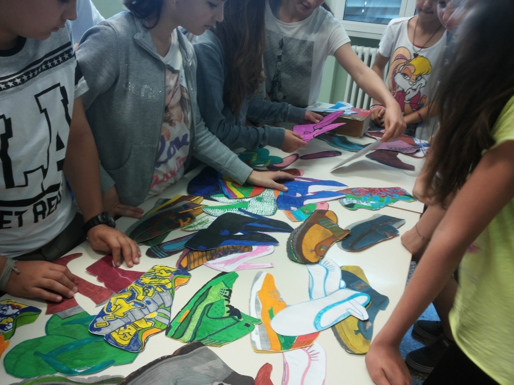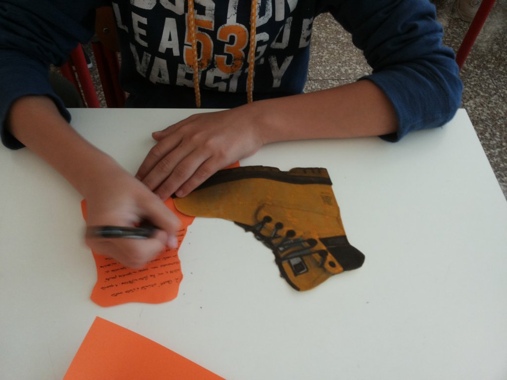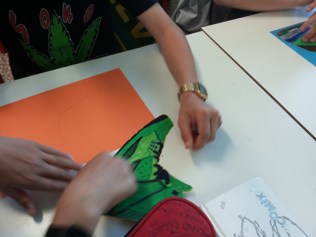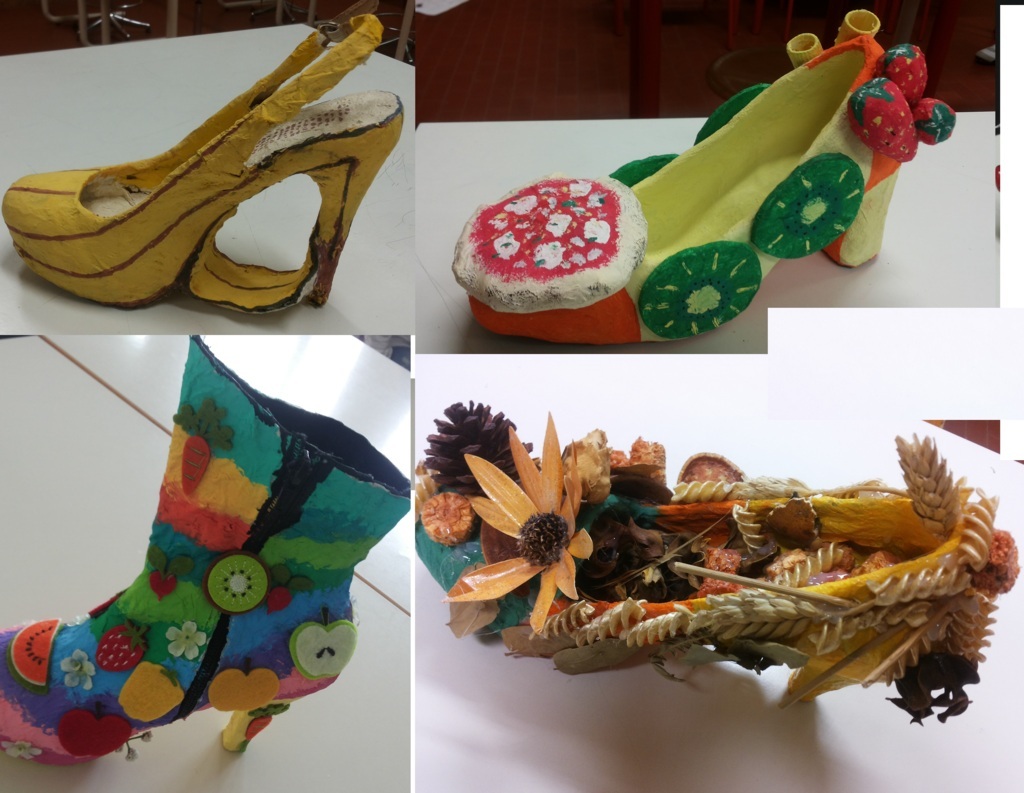 Sono subentrate le educatrici che seguono il gruppetto dei ragazzi dello “Staff SDS” (avrete capito che sono i ragazzi che “vivacizzano” la nostra scuola… diciamo che ci “stimolano” ad essere creativi) che hanno portato avanti la ricerca delle tipologie di scarpe, hanno preparato le sagome, letto e sintetizzato la storia “Scarpe verdi di invidia” (ci vorrebbe una parentesi per raccontarvi come siamo arrivati a questo libro… ma ve la risparmio) e presentato l’attività a tutti gli altri studenti.