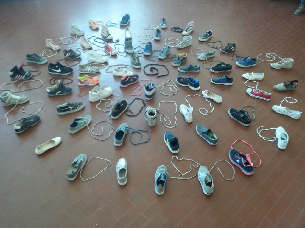 Vorrei riportarvi esattamente le fasi del dialogo tra i docenti (ho anche provato…) ma diventerei noiosa; sta di fatto che tutto è partito con l’idea di partecipare all’ iniziativa del MIUR “Gioca-nei-miei-panni” . Nelle ore di supplenza una nostra preziosissima collega ha presentato ai ragazzi di alcune classi il sito dedicato all’iniziativa con un primo intento di portarli a mettersi nei panni dell’immigrato che si trova ogni giorno ad affrontare situazioni da risolvere attraverso un vero e proprio gioco… poi c’è stato il famoso “sit in” davanti alla macchinetta del caffè: dai “panni” alle “scarpe” … c’è voluto poco … la prof. di arte si è subito attivata per la parte creativa … e che parte!!! E il progetto si è orientato verso l’empatia e il tentativo di contrastare il bullismo.